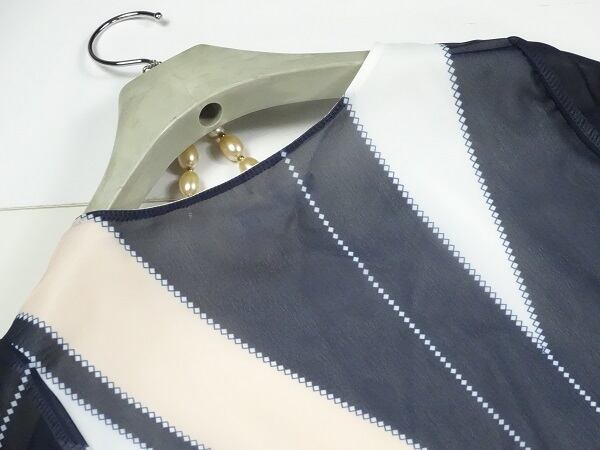 変則ストライプ膝丈ワンピ-スです。やわらかなシフォン地に、紺、ベージュ、薄い水色でストライプをプリント。両サイドの裾部分に17cmのスリットがあります。シックで上品な女性を表現してくれさまざまシーンで活躍してくれる大人の一着です。ファスナーなし(かぶるタイプ)。裏地有。