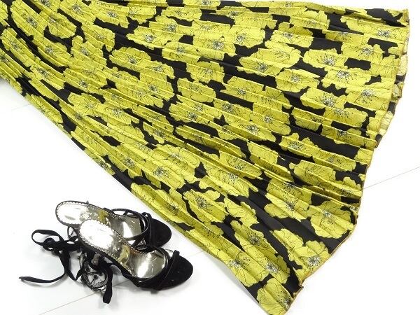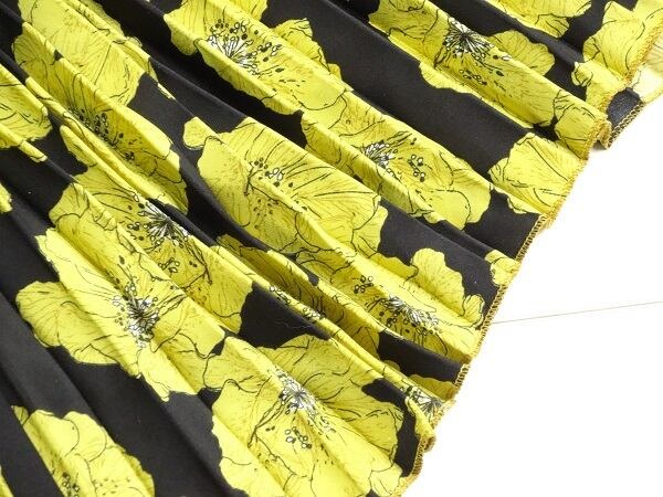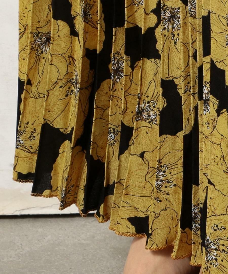 シックなボタニカル柄ロングプリ-ツスカ-ト。黒地に落ち着いたマスタードカラーのボタニカル柄をプリント。さらっとした生地が心地よく、動くたびに揺れるエレガントなスカ-トです。女子力UP間違いなしとおもいます。ウエストはゴム仕様で伸縮性あり。ファスナ-なし。裏地なし。