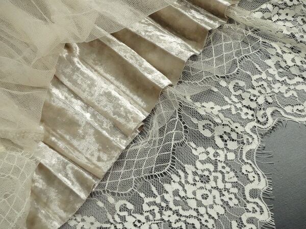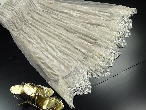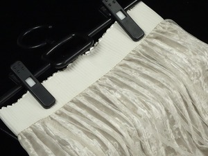 光沢ロングプリ-ツスカ-トです。動くたびに揺れるエレガントなプリ-ツスカ-トです。プリ-ツの上にチュ-ルが重ねられたデザインです。ファスナ-なし(ウエストゴム仕様)。裏地なし。