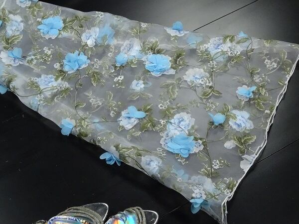 透け感が美しい花モチーフのオーバーワンピ-ス。シースルーのオーガンジーに青を基調とした花柄プリントと、花モチーフをあしらったオーバーワンピース。下に、お手持ちのキャミソールや、Tシャツ、キャミタイプのワンピースを合わせてコーディネートを楽しんでいただきます。シックでやさしくエレガントな一着です。ファスナーなしのかぶるタイプ。裏地なし。