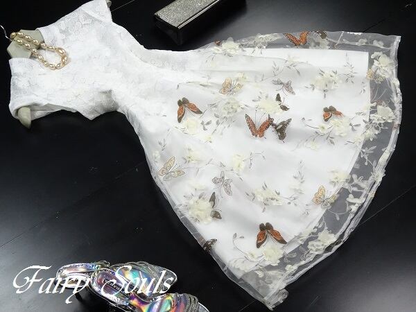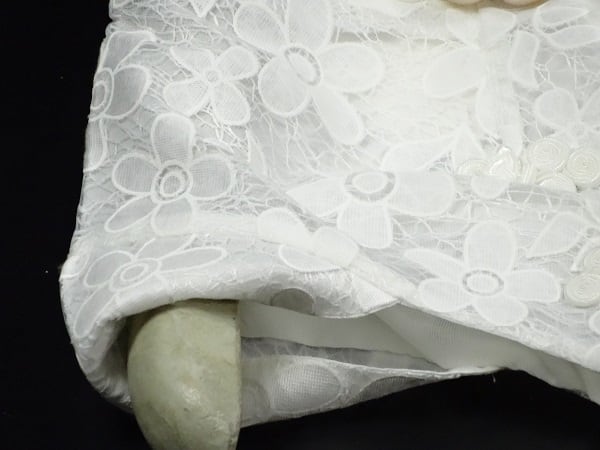 上品な花柄レ-ス膝丈ワンピ-スです。トップス部分は白の下地に花柄のレ-スが重ねられ、スカ-ト部分はオ-ガンジ-の生地がフレア-に広がりしぐさを優雅に見せてくれる贅沢なお洋服です。可愛らしいデザインで全体的に優しい感じに仕上げられています。背中ファスナ-有。裏地あり。