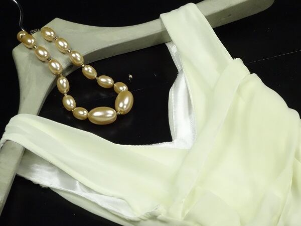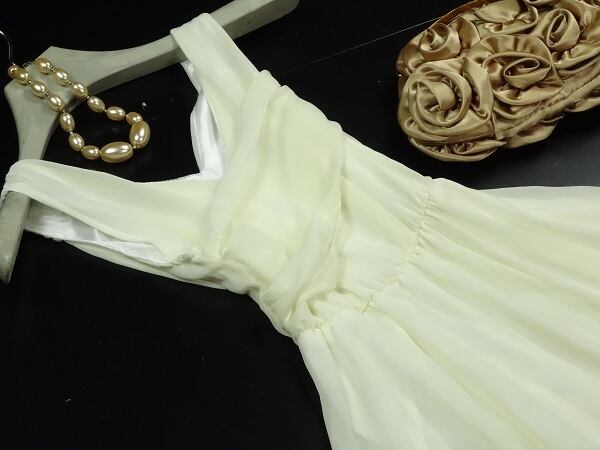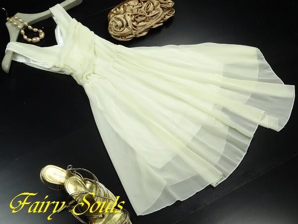 涼し気なカラ-で軽やか、両方の飾りがとても綺麗なシフォンワンピ-スです。裾はランダムで長さが5cm程異なります。ファスナ-なし(かぶるタイプ)。裏地有。