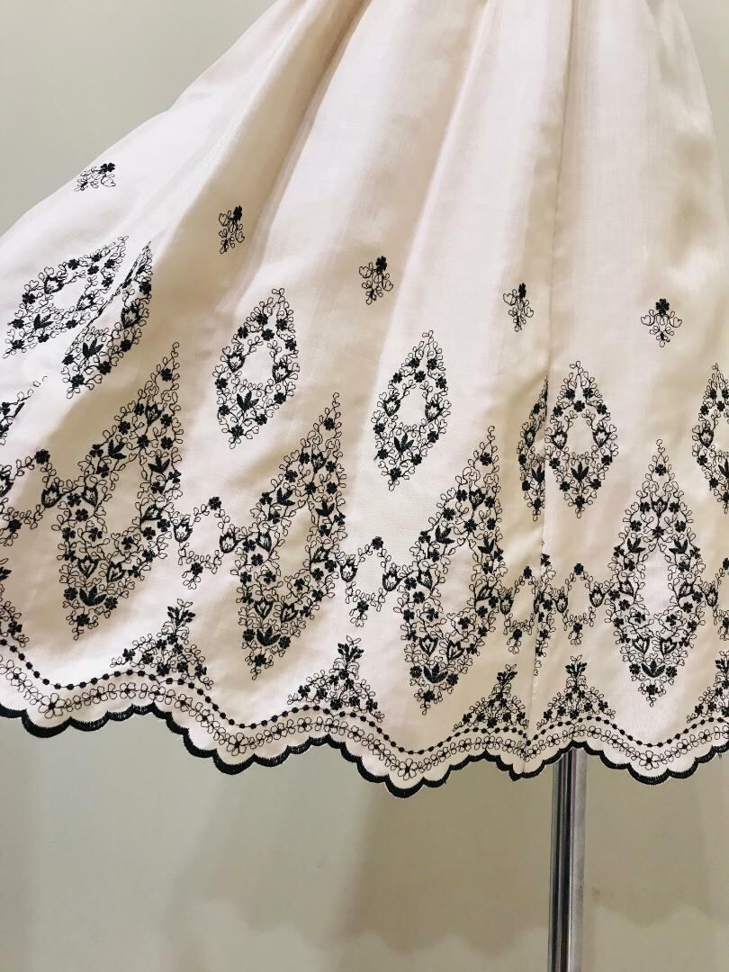 花柄刺繍が魅力的なサテンのワンピース。艶のあるサテン地に、裾には黒で縁取りをし、花の刺繍を施した上品なデザイン。襟元は深いU字カットで、中央にゆるいタックをとり、ウエストできゅっと絞っています。袖はかわいいフレンチタイプ。ウエストはゴム仕様で伸縮性があります。裾のV字カットがシックで落ち着いた大人の魅力あふれる一着です。ファスナーなしのかぶるタイプ。裏地有。
