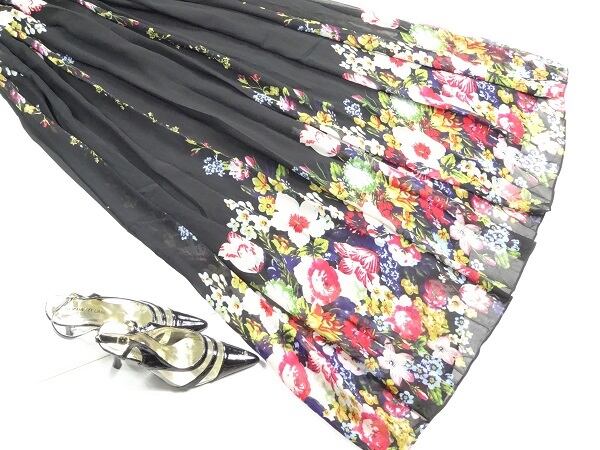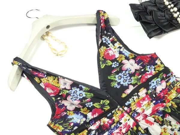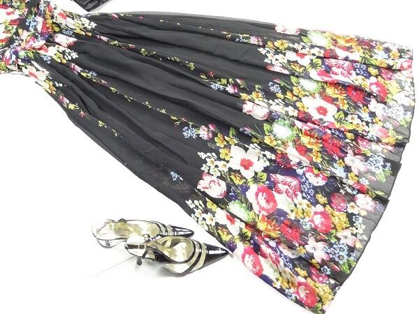 胸元V字カットのロングドレスワンピース。しなやかな黒地にカラフルな花柄をプリントした生地たっぷりと使用。ウエストで横にドレープをとりアクセントに。裾にかけてふんわりと流れるラインが美しいデザイン。エレガントで上品な女性を表現してくれています。パーティやイベント、コンサート、結婚式にと、さまざまシーンで活躍してくれる美しい一着。背中ファスナー有。裏地あり。