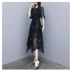 星柄アシンメトリ-ワンピース。ネイビ-地に落ち着いた色合いの星柄をプリント。透け感のあるしなやかな袖と裾が不規則なアシンメトリ-になっていてバランスが良く、軽やかでピュアでフェアリーなデザインになっています。煌めく太陽の光の中でも、また新緑の爽やかな風の中でも、着る人を美しく魅せてくれる一着です。裏地有り。ファスナ-なし(前ボタン)。