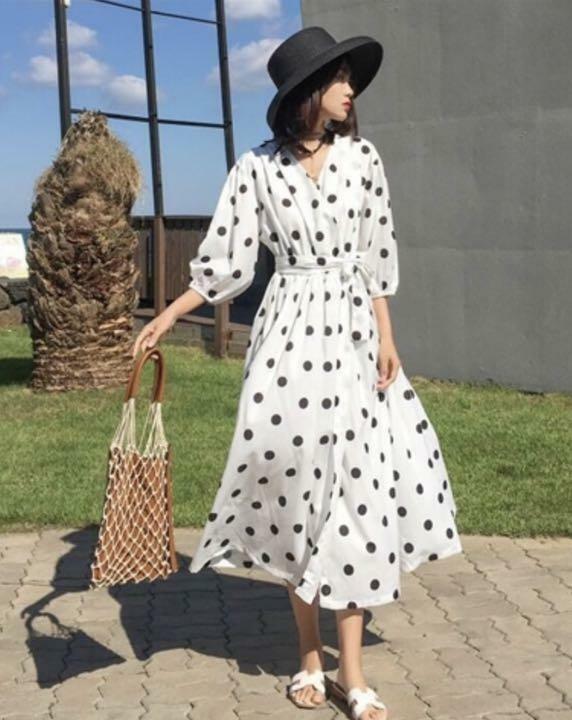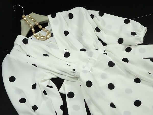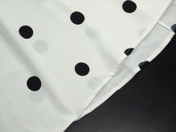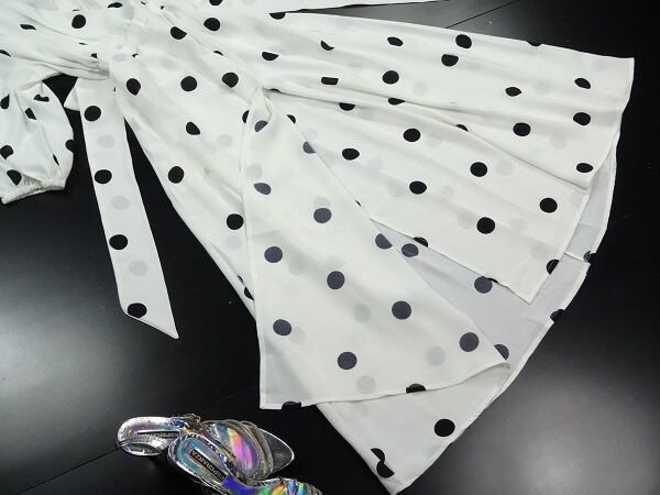 水玉フレア-マキシ丈ワンピ-スです。白地に黒の水玉がプリントされたエレガントでフェミニンな一着です。スカ-ト部分前に約55cmのスリット有。ファスナ-なし(かぶるタイプ)。裏地なし。同布ベルト付き。