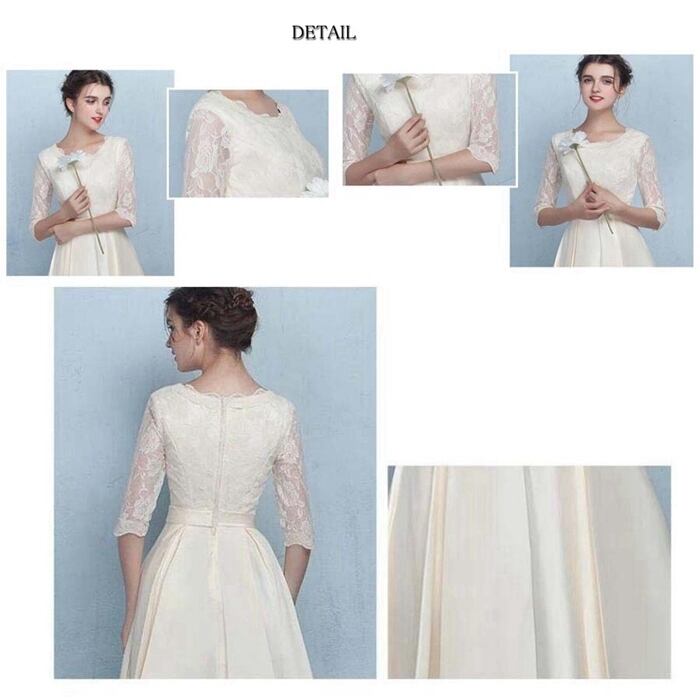 エレガントパ-ティ-ワンピ-スです。気品に満ちたとてもエレガントで上品なひとクラス上をいく一品です。トップス部分のレースの透け感もとても上品でエレガントです。裏地有。背中ファスナ-有。胸パット付き。