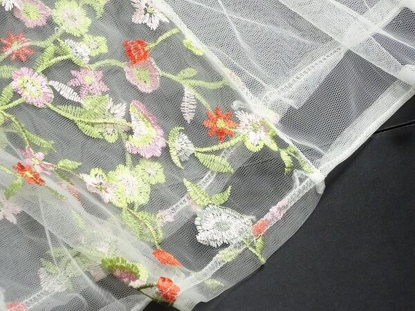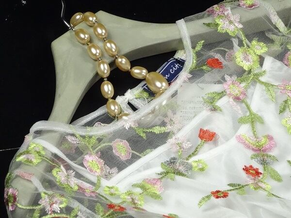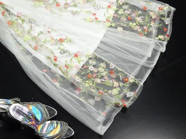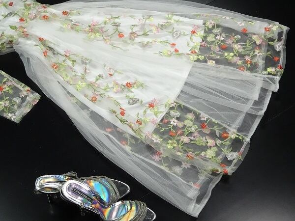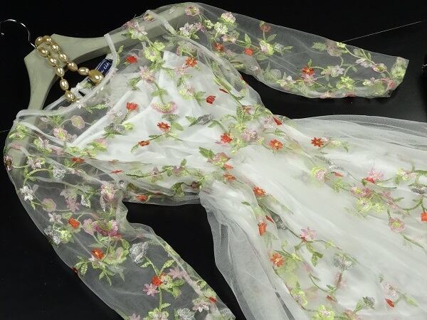 トレンド刺繍花柄チュ-ルワンピ-スです。トレンド感たっぷり色の美しいエレガントなワンピ-スです。デザイン性のあるスタイルがとても魅力的な一着です。可愛いデザインで全体的に優しい感じに仕上げられています。ファスナ-なし(かぶるタイプ)。キャミソ-ル付き。