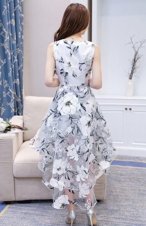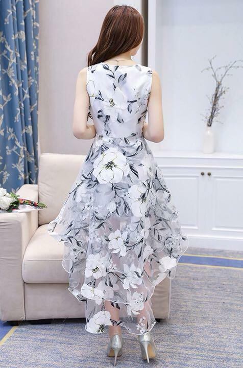 3段フリルフィッシュテ-ルのドレス。前が短く、後ろが長いフィッシュテ-ルタイプ。艶のあるサテンシフォンにシックなモノトーンの花柄をプリント。襟は浅いラウンドネックで袖はノースリーブ。3段のフリルの裾がひらひらと華やかで豪華な印象に。パーティやイベント、結婚式など、様々なシーンで、気品のある印象を与えてくれる一枚です。裏地有。右脇ファスナ-有。