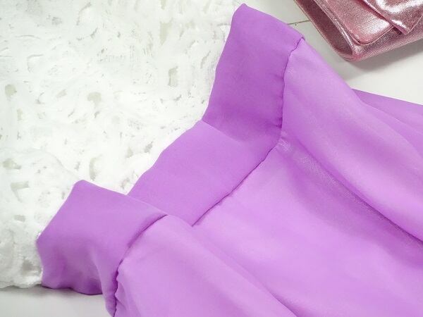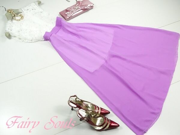 レースとシフォンのロングドレス。トップスはサテン地の上に白のカッティングレース。ウエストからスカート裾までは藤色のシフォンをたっぷり使用し、綺麗なシルエットが揺れるごとに着る人の足元を美しく見せてくれる魅力的なドレスです。ウエストはゴム仕様で伸縮性があります。パーティやライブ、イベント、結婚式など、どんなシーンでも活躍してくれる一着です。背中ファスナー有。裏地付き。