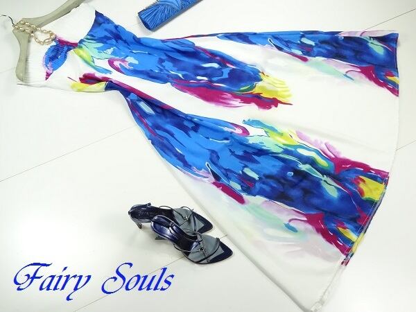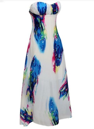 胸元プリーツシフォンのベアロングドレス。胸元はプリーツ仕様。白地に鮮やかなカラーをプリントしたしなやかな生地をたっぷりと使用し、セクシーで優雅な印象に。パーティや発表会、演奏会やステ-ジ衣装にお薦めです。裏地有。背中ファスナ-有。パット有。透け感なし。