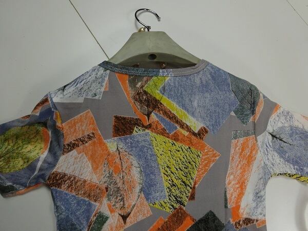 ジャージ素材POP柄のフィッシュテール半袖ワンピ-ス。グレー地にカラフルな色で幾何学模様をプリント。前と後ろの長さが違うフィッシュテールのおしゃれなデザイン。さらっとした伸縮性のあるジャージ素材で軽い着心地。丸めて、旅行先にもっていけば重宝する一着です。裏地なし。ファスナ-なしのかぶるタイプ。