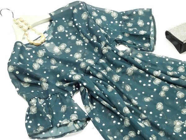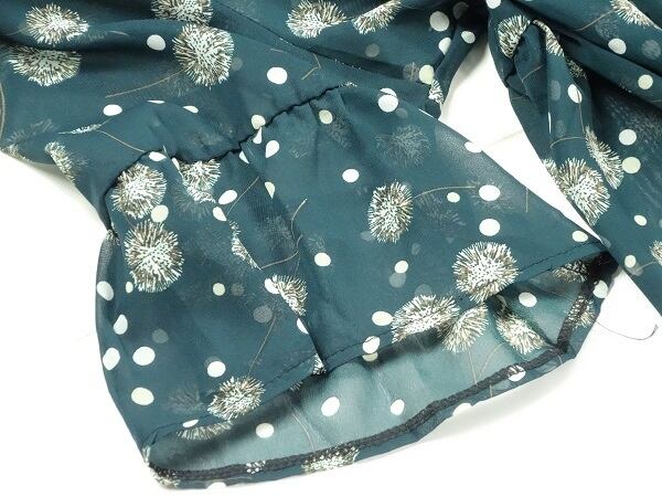 花柄プリントシフォンのオーバーワンピ-ス。しなやかな深いグリーンの地に花柄をプリント。やさしいラウンドネックに袖先のフリルがキュートな印象に。透け感がありますので、インナー着用をおすすめします。幅広サイズですのでオーバーワンピースとして。お手持ちのベルトでウエストをしぼると、また違った雰囲気に。落ち着いた色合いが、優しい女性の印象を与えてくれる一着です。裏地なし。ファスナ-なしのかぶるタイプ。