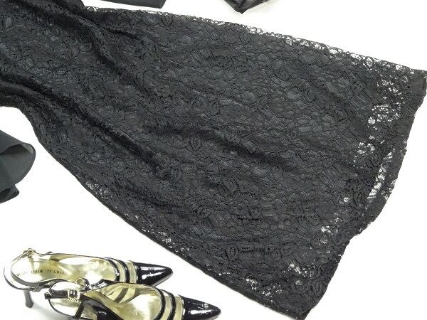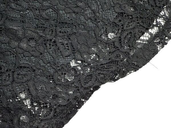 総レース袖フリルのワンピ-ス。黒地のネットチュールに花柄刺繍をあしらい、エレガントで上品な印象に仕上がっています。袖は黒のシフォン地を重ねて、腕を動かすと肩から腕がのぞくようなデザインに。ちょっとおしゃれな普段着としても、またパーティやコンサート、結婚式の二次会にと、フォーマルなシーンにも活躍してくれる、大人の女性を醸し出してくれる一着です。サイズはSですが、ゆったりしていますので9号位のかたでも大丈夫かと思います。裏地あり。背中ファスナ-有。