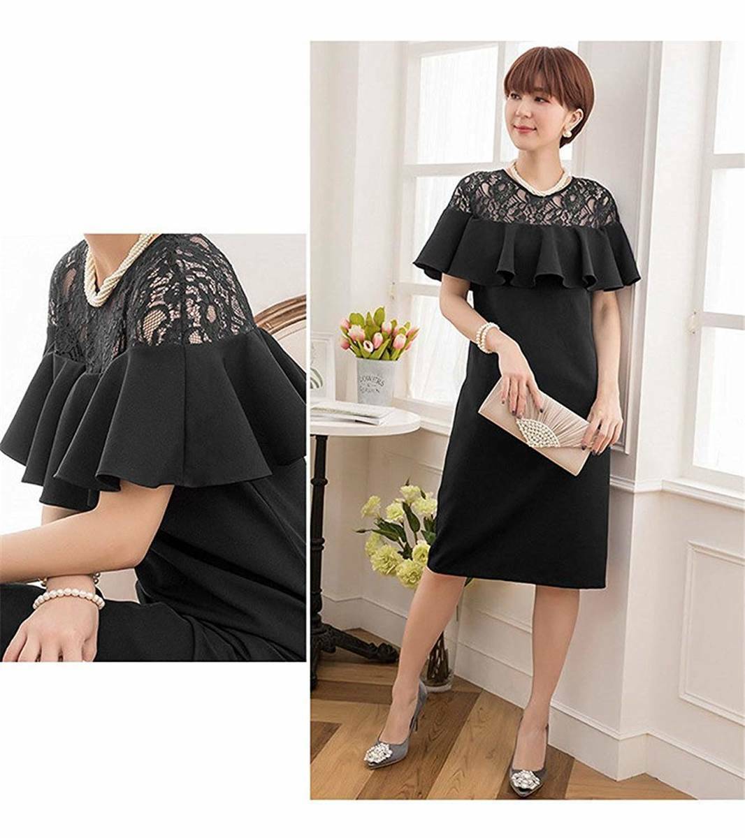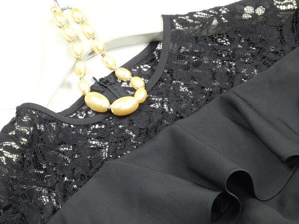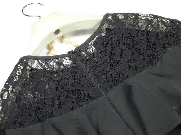 エレガントな膝丈ワンピ-スです。首回りのレース刺繍がエレガントで上品な印象に仕上がっています。フォーマルなシーンに活躍してくれる、大人の女性を醸し出してくれる一着です。裏地有。背中ファスナ-有。
