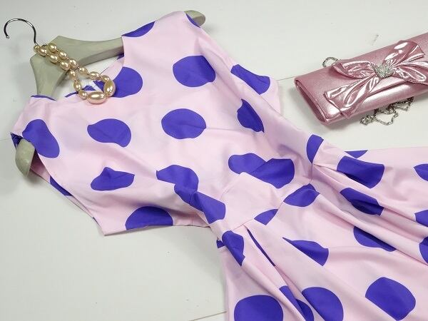 水玉フレア-ワンピ-スです。涼し気なワンピ-スでリボンベルトも取り外し出来ます。背中ファスナ-有。裏地なし。背中ファスナ-有。リボンベルト付き。
