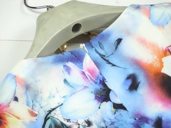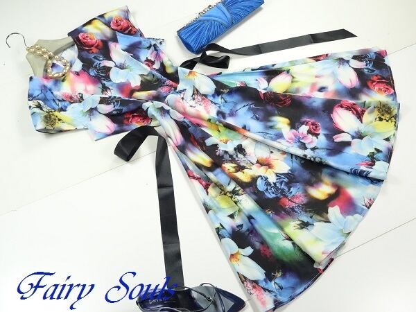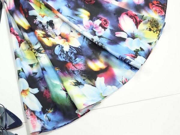 綺麗な花柄膝丈フレア-ワンピ-スです!綺麗な色合いが、いろいろな表情を魅せてくれ、大人の高級感でフェミニンな一着です。裏地なし。背中ファスナ-有。布ベルト付き。