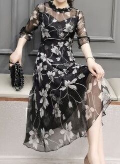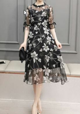 プリントが美しい半袖フレア-ワンピースです。黒地に墨色のプリントが大人っぽく上品で清楚な印象です。パーティや結婚式に。背中ファスナー。裏地あり。