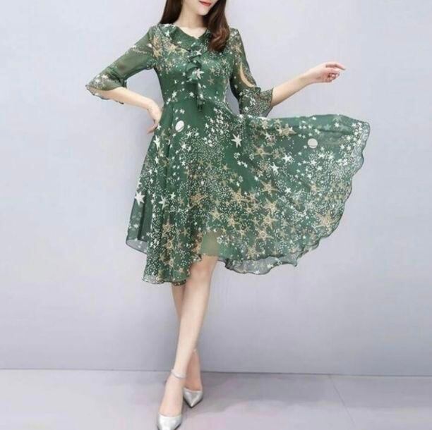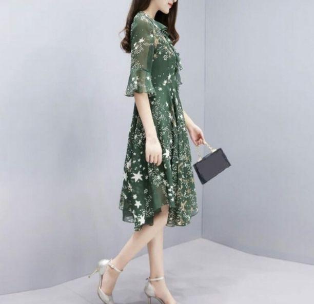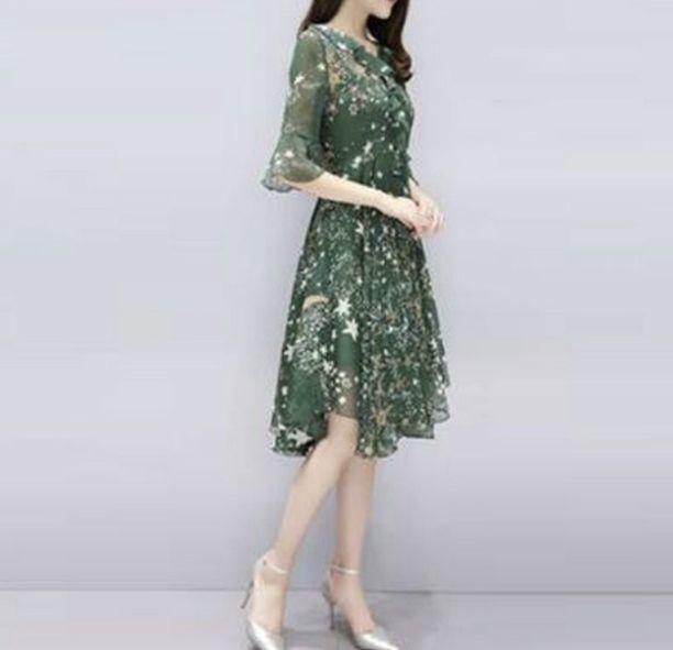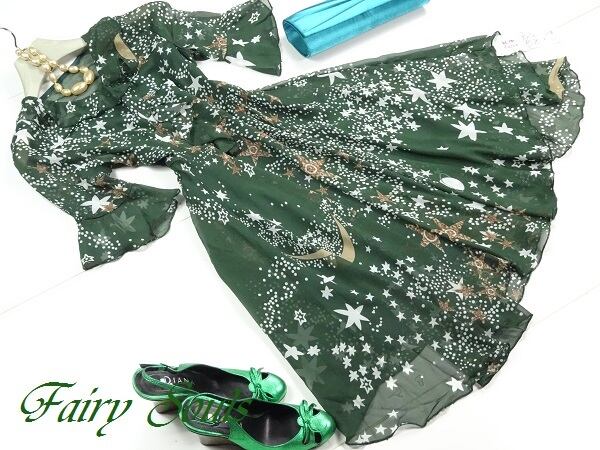 プリントが美しいチュ-リップ半袖フレア-ワンピースです。緑地にMIX色のプリントが大人っぽく上品で清楚な印象です。パーティや結婚式に。右サイドファスナー有。インナ-付き。