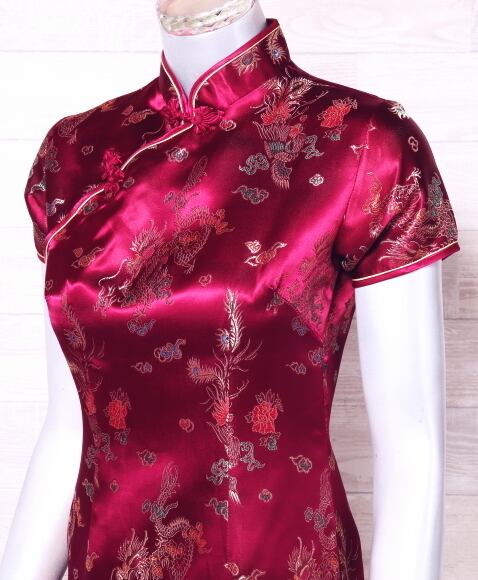 金糸刺繍ロングチャイナドレスです。ワインレッド地にゴ-ルドの刺繍がとても豪華で綺麗な一着です。スリムな大人の女性を醸し出してくれる一着です。裏地なし。右サイドファスナ-有。両サイド54cmのスリット有。