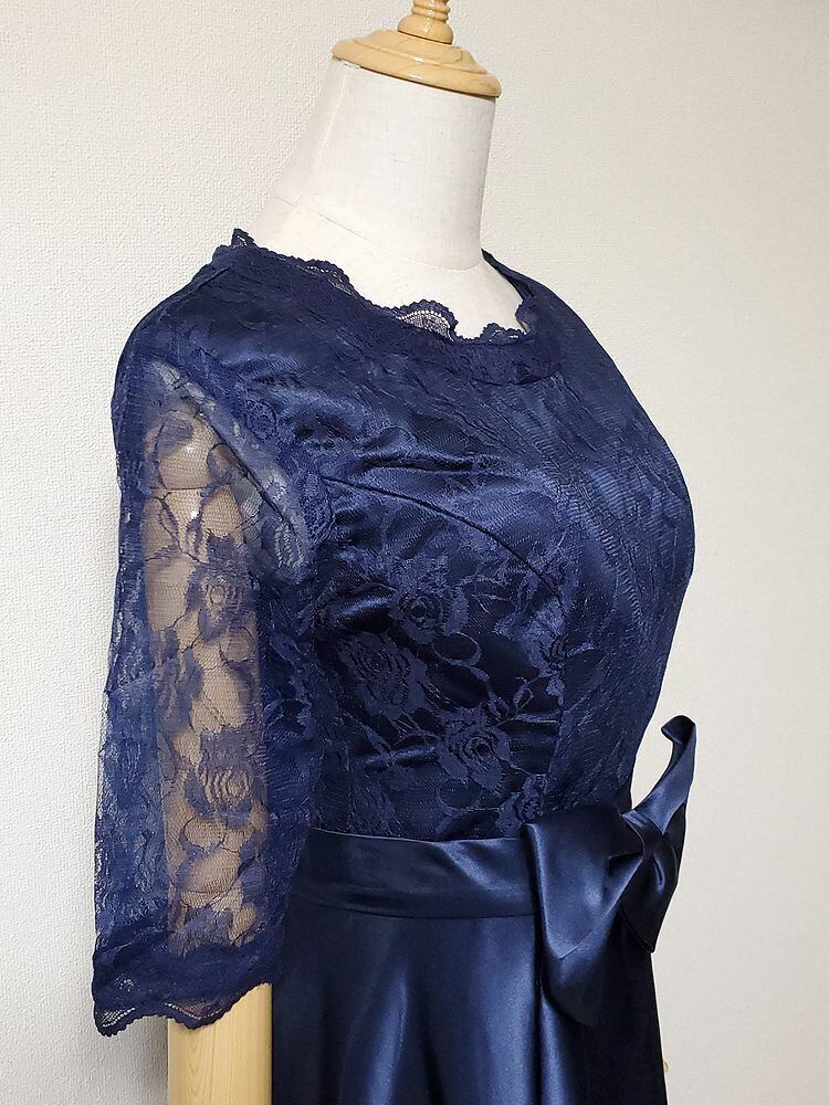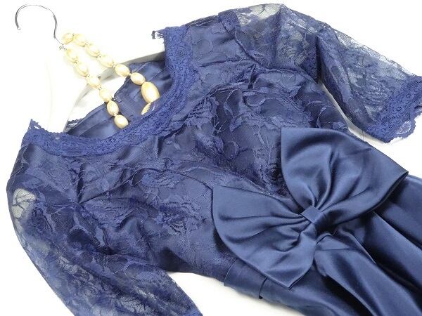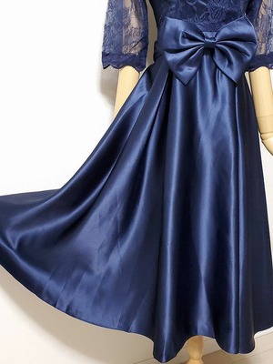 エレガントパ-ティ-ワンピ-スです。ウエストの大きなリボンがとても可愛い気品に満ちたとてもエレガントで上品なひとクラス上をいく一品です。トップス部分のレースの透け感もとても上品でエレガントです。裏地有。背中ファスナ-有。胸パット付き。