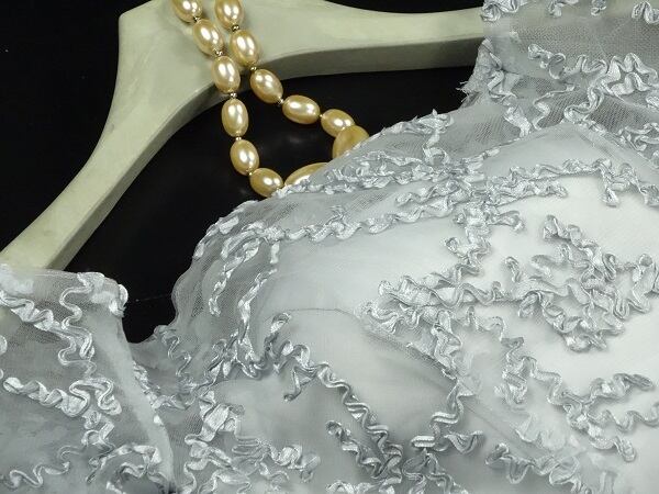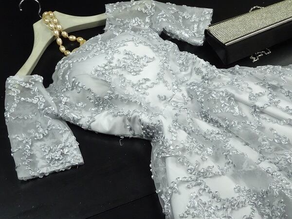 立体刺繍フィッシュテ-ルパ-ティ-ドレです。全体にシルバ-色の立体刺繍が施されていてとても豪華です。肩から袖にかけては透けとてもエレガント、スカート部分は前と後ろの長さが異なるフィッシュテ-ルになっています。。パーティやイベント、結婚式など、様々なシーンで、気品のある印象を与えてくれる一枚です。裏地有。背中腰から下ファスナ-有。(背中結び紐有り)。胸パット付。