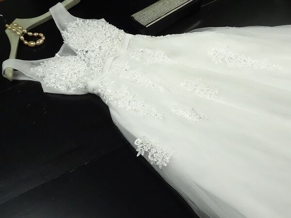 背中飾りボタン付き胸元刺繍飾りカラ-ドレスです。ウエストからスカート裾までは、しなやかなシフォンが揺れるごとに着る人の足元を美しく見せてくれます。胸元は立体刺繍が背中は飾りボタンが施されとても豪華です。パーティやライブ、イベント、結婚式など、どんなシーンでも活躍してくれる一着です。裏地有。背中ファスナー有。胸パット付き。