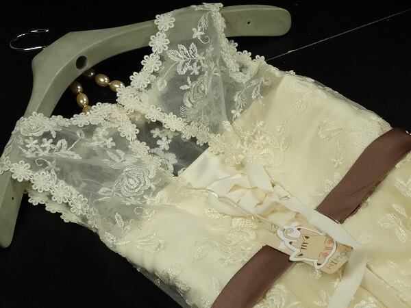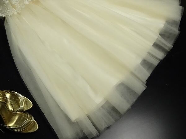 立体刺繍チュールのパ-ティ-ドレスです。トップスにゴールド糸の立体刺繍が施されていてとても豪華です。スカート部分はサテン地の上に3重の同色のチュールが重ねられ豪華かつエレガントな雰囲気に。パーティやイベント、結婚式など、様々なシーンで、気品のある印象を与えてくれる一枚です。背中腰から下ファスナ-有。(背中結び紐有り)。胸パット付。