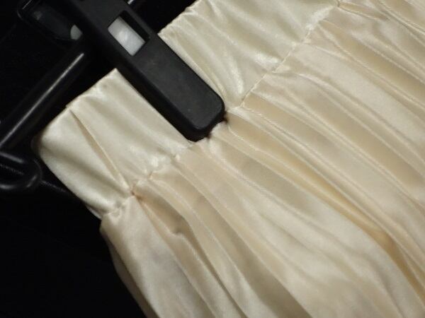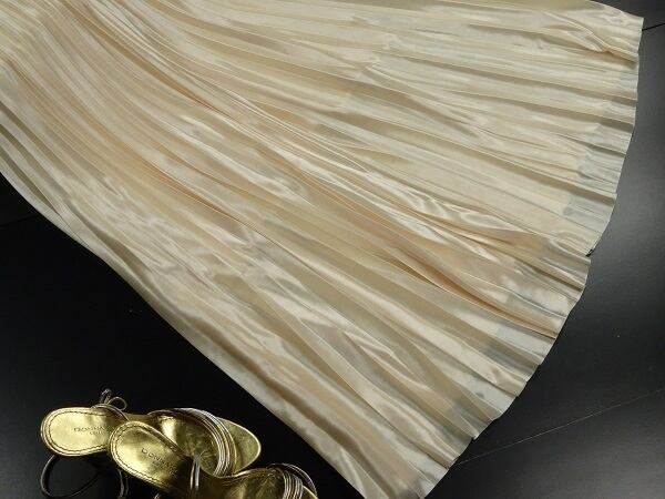 メタリックピンクゴールドの光沢プリ-ツロングスカ-トです。光沢の輝きがとても綺麗で歩くたびの揺れ感がプリ-ツならではでとても女性らしくまるで女優になった気分にさせてくれます。大人のエレガンスさを感じさせてくれるデザインです。裏地あり。