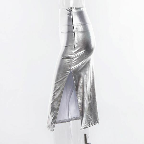 光沢感のあるメタリックシルバ-タイトスカ-トです。PUレザ-素材で綺麗な光沢またハイウエストのデザインで脚長効果ありのスカ-トです。右サイド下から40cmスリットになっています。裏地なし。右サイドファスナ-有。