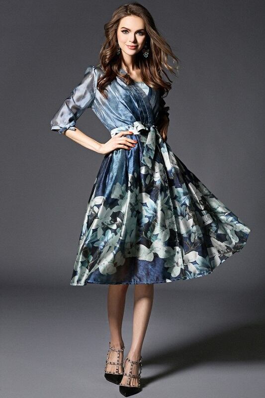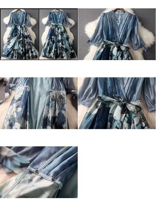 大きな花模様がプリントされたシックなワンピース。トップスは透け感があり、インナーがほんのりと見え、品の良いセクシー感をかもしだしています。袖はリボンがついた七分袖。トップスは細いタックがとられたカシュクール仕様。ウエストを共布のベルトリボンでキュッと絞るデザイン。シックでやさしくエレガントな一着です。ファスナーなし。インナー付。