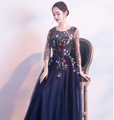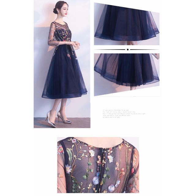 花刺繍ミモレ丈チュ-ルパ-ティ-ドレスです。深いネイビ-のサテン地の上に、ネイビ-の花刺繍をほどこしたチュ-ルが重ねられた豪華でフェミニンなデザイン。デコルテラインから肩にかけての透け感が大人の雰囲気を醸し出し、シックで上品な女性を表現。パーティやイベント、コンサート、結婚式にと、さまざまシーンで活躍してくれる美しい一着。背中ファスナー有。胸パット付。