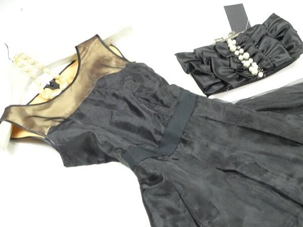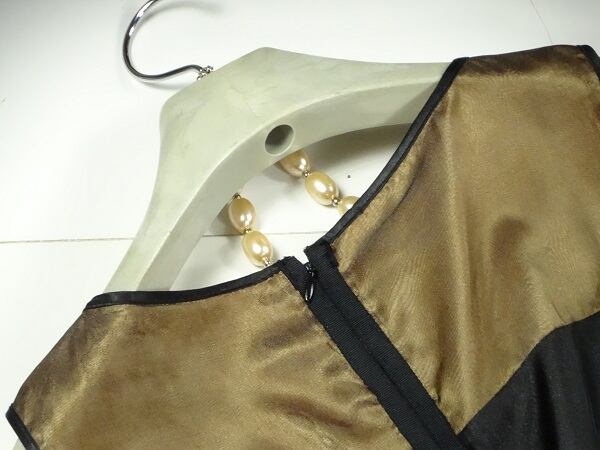 オーガンジーのパ-ティ-ドレス。ゴールドサテン地の上に黒のオーガンジーを重ねた綺麗なデザイン。胸元は透け感があり、フェミニンで魅力的な印象に。シックで上品な女性を表現。パーティやイベント、コンサート、結婚式にと、さまざまシーンで活躍してくれる美しい一着。裏地有。背中ファスナー有。