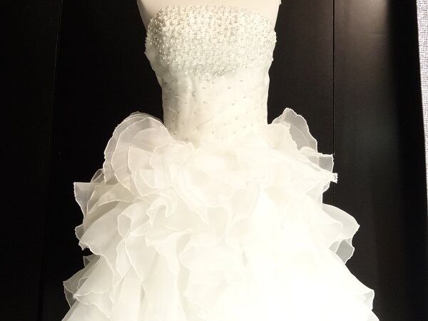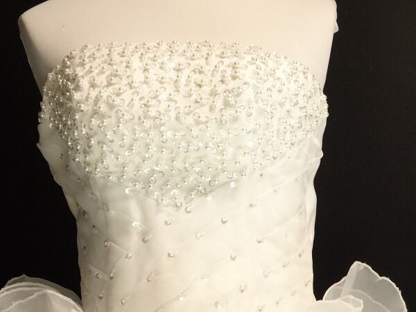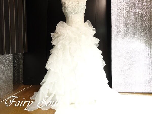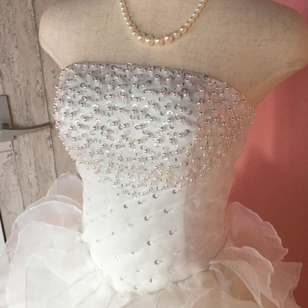 ベアフリルのウエディングドレス。デコルテラインが美しいベアタイプの胸元にはスパンコールとフェイクパールをいっぱいにちりばめ、ウエストから下のスカート部分はたくさんのフリルで可愛く華やかな印象に。背中はリボンの編み上げタイプで、ウエストから下にファスナーがついています。可愛くピュアで豪華な一着です。着脱は背中リボンの編み上げ。ウエスト下ファスナー有。裏地あり。