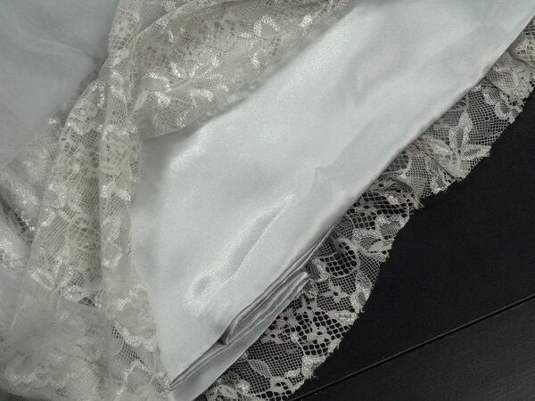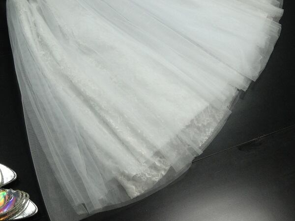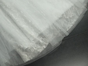 刺繍チュールマキシ丈パ-ティ-ドレスです。トップスと袖先に白糸の立体刺繍が施されていてとても豪華です。肩から袖にかけては透け感がとてもエレガントです。全体的にサテン地の上に無地のチュールをたっぷりと重ね豪華な雰囲気に。パーティやイベント、結婚式など、様々なシーンで、気品のある印象を与えてくれる一枚です。背中ファスナ-有。胸パット付。
