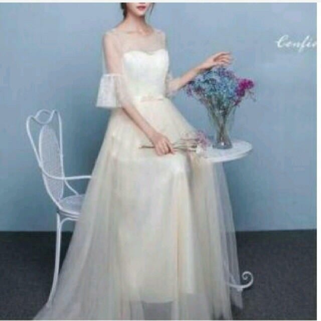 チュールロング丈パ-ティ-ドレスです。トップス部分は刺繍が施されていてとても豪華です。肩から袖にかけては透け感がとてもエレガントです。全体的にサテン地の上に無地のチュールをたっぷりと重ね豪華な雰囲気に。パーティやイベント、結婚式など、様々なシーンで、気品のある印象を与えてくれる一枚です。背中結び紐有り。背中腰から下ファスナ-有。胸パット付。