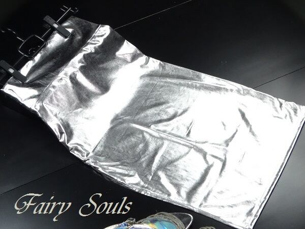 光沢感のあるメタリックシルバ-タイトスカ-トです。PUレザ-素材で綺麗な光沢またハイウエストのデザインで脚長効果ありのスカ-トです。右サイド下から40cmスリットになっています。裏地なし。右サイドファスナ-有。