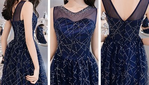パ-ティ-ロング丈ドレスです。深いネイビ-のサテン地の上に、シルバ-のビジュ-が散りばめられたチュ-ルが重ねられた豪華でフェミニンなデザイン。デコルテラインの透け感が大人の雰囲気を醸し出し、シックで上品な女性を表現。パーティやイベント、コンサート、結婚式にと、さまざまシーンで活躍してくれる美しい一着。背中ファスナー有。胸パット付。