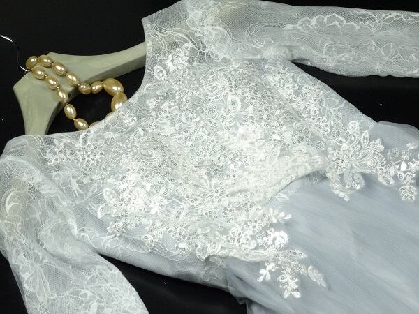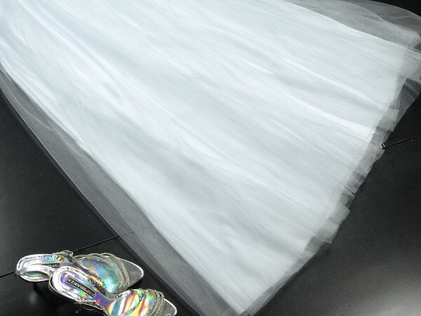 立体刺繍チュールのパ-ティ-ロングドレスです。トップスに白糸の立体刺繍が施されていてとても豪華です。スカート部分はサテン地の上に2重の同色のチュールが重ねられ豪華かつエレガントな雰囲気に。パーティやイベント、結婚式など、様々なシーンで、気品のある印象を与えてくれる一枚です。背中腰から下ファスナ-有。(背中網掛け)。胸パット付。裏地有。