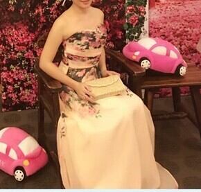 天使のようなとても見栄えのする豪華なプリントシフォンロングドレスです。胸元はプリ-ツでスカ-ト部分はたっぷりと生地を使い大変ボリュ-ム感のある女性らしい素晴らしいドレスです。軽やかでしなやかな生地で裾が歩くたびにひらひらと揺れ、足元を美しく見せてくれます。裏地付。背中網掛け。