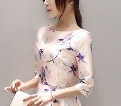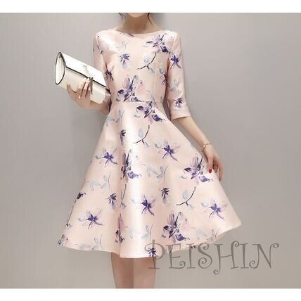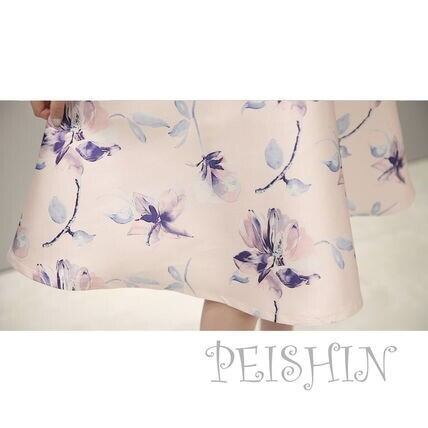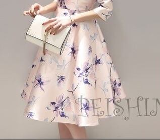 花柄プリント光沢フレア-ワンピ-スです。ピンクとブル-の花柄プリントがとても素敵で上品かつ豪華で飽きのこない着まわせる一着です。裏地なし。背中右サイドファスナ-有。