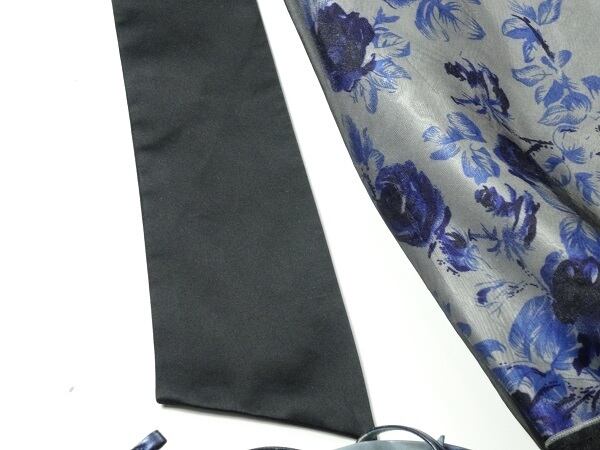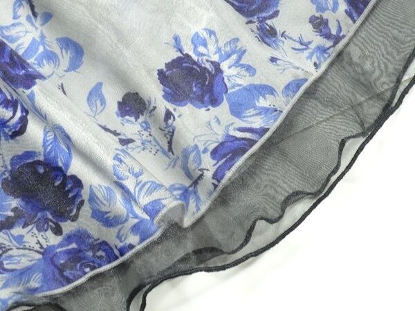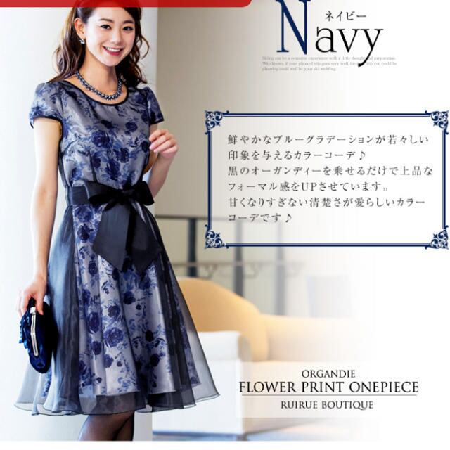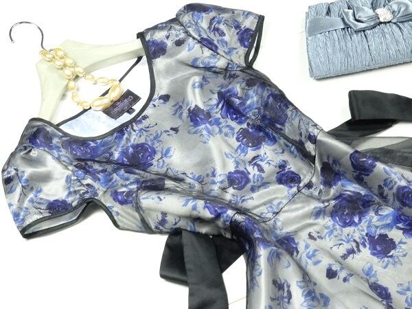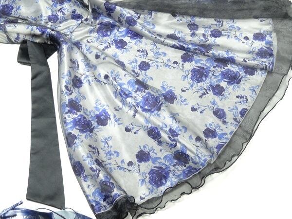 サテン花柄レース重ねフレア-ワンピ-スです。ネイビ-の花柄のサテン生地に黒のレ-スが重ねてある大人っぽいワンピ-スです。左サイドファスナ-有。サッシュベルト付。