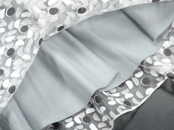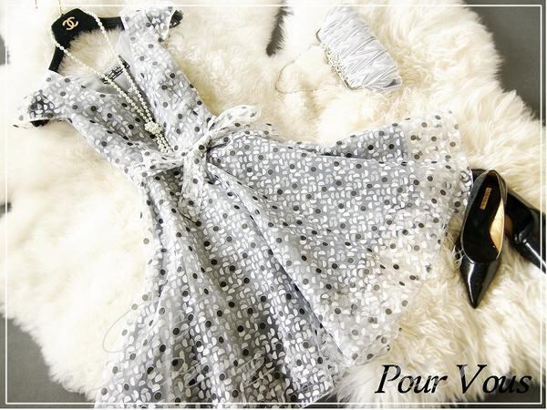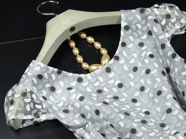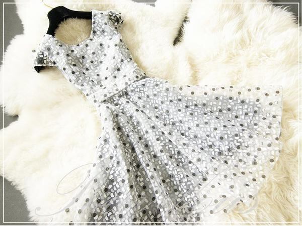 セレブな水玉模様が美しいワンピースです。グレーベースで落ち着いた色調の中に、黒と白のドット柄が程よく配置され、スカート部分は生地をたっぷりとっていて、ゆったりとした、エレガントな印象を与えています。ウエストリボン付。左脇下ファスナー。裏地付。