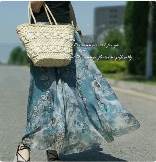 花柄プリントシフォンフレア-スカ-トです。ブル-系にとても美しい花柄プリント模様のシフォンが歩くたびにふんわりと揺れる魅力的なシルエット。リゾートコーデにも最適です!ウエストゴム仕様で伸縮性あり。裏地付。