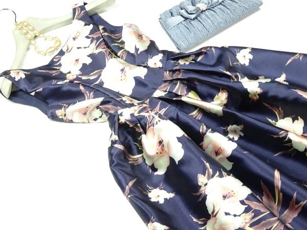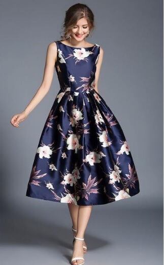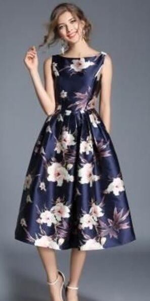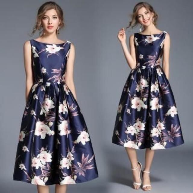 フラワ-織りミモレ丈フレア-ドレスです。ふくれ織りの生地に花柄プリントがとても上品かつ豪華で飽きのこない着まわせる一着です。裏地有。背中ファスナ-有。