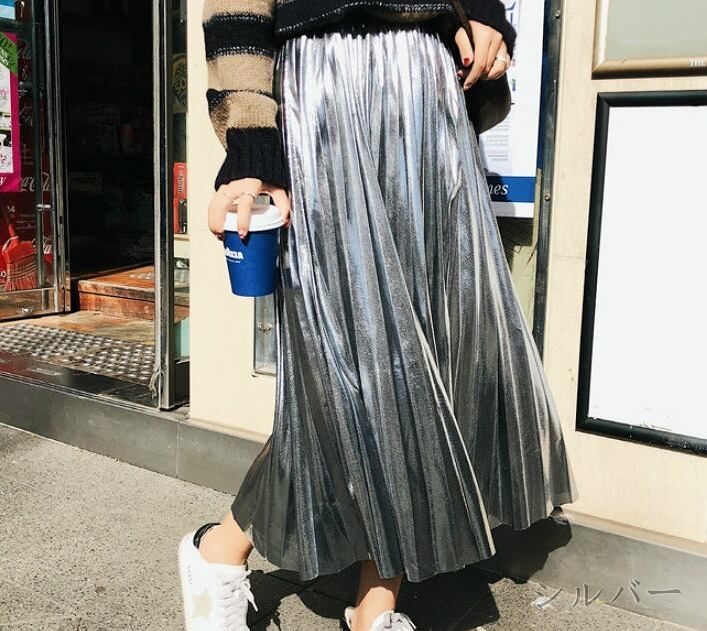 メタリックシルバ-の光沢プリ-ツスカ-トです。光沢の輝きがとても綺麗で歩くたびの揺れ感がプリ-ツならではでとても女性らしくまるで女優になった気分にさせてくれます。大人のエレガンスさを感じさせてくれるデザインです。裏地あり。