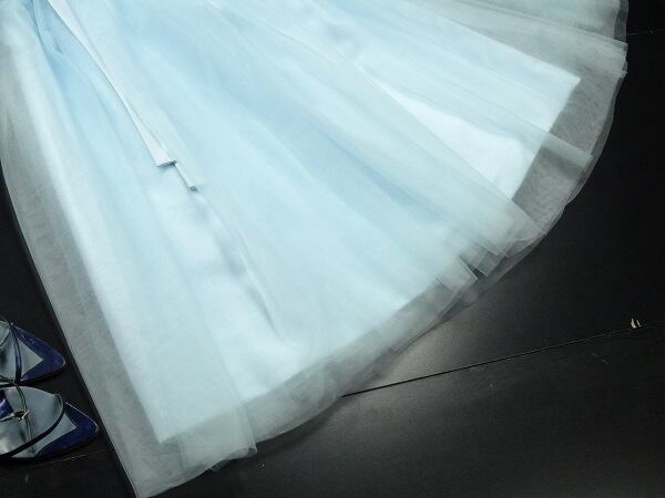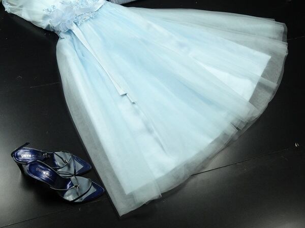 トップス部分立体花柄刺繍チュールパ-ティ-ドレスです。トップスに水色糸の立体刺繍が施されたレースが重ねられとても豪華です。全体的にサテン地の上に無地のチュールをたっぷりと重ね豪華な雰囲気に。パーティやイベント、結婚式など、様々なシーンで、気品のある印象を与えてくれる一枚です。背中ボタン有。胸パット付。