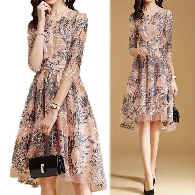 ラベンダー色ボタニカル刺繍の上質ワンピースです。やさしいラベンダーのチュール地にカラフルなボタニカル刺繍をほどこした可愛らしいデザインで後ろの丈が少し長いです。透け感がキュートなセクシー感を演出。優しい感じのワンピ-スです。背中ファスナーあり。裏地あり。