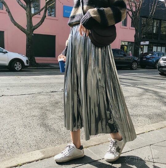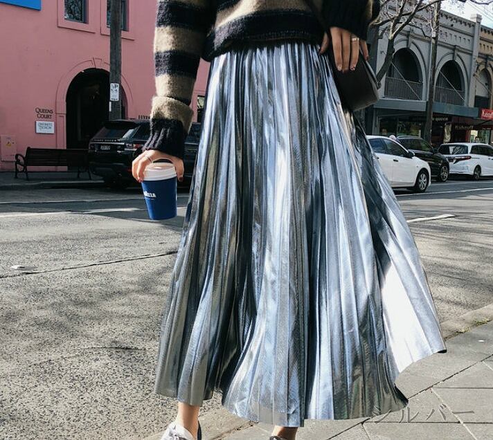 メタリックシルバ-の光沢プリ-ツスカ-トです。光沢の輝きがとても綺麗で歩くたびの揺れ感がプリ-ツならではでとても女性らしくまるで女優になった気分にさせてくれます。大人のエレガンスさを感じさせてくれるデザインです。裏地あり。