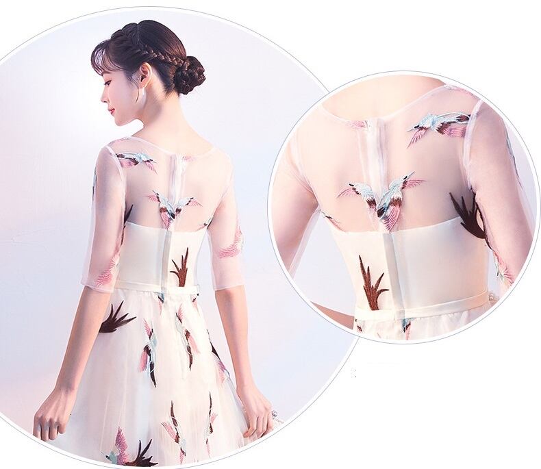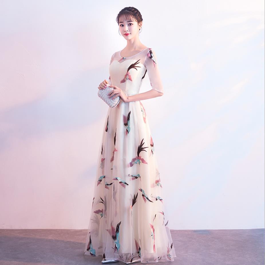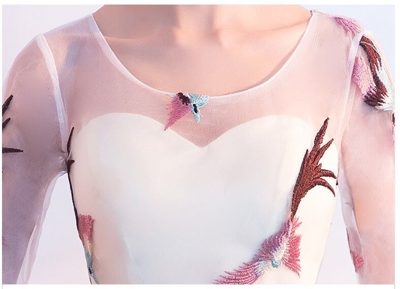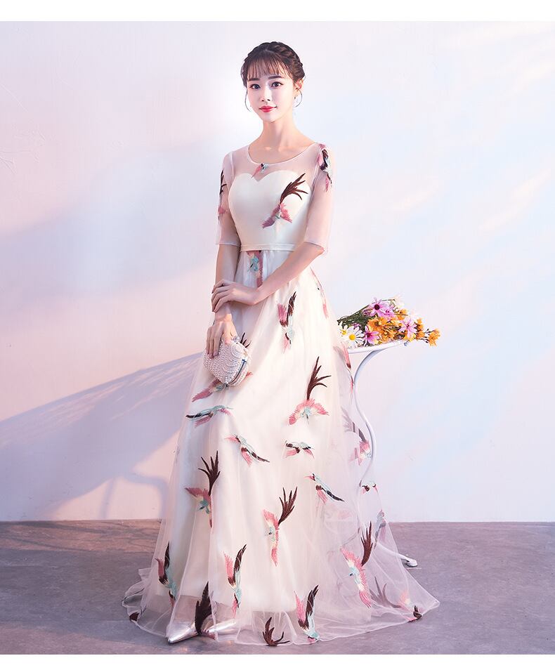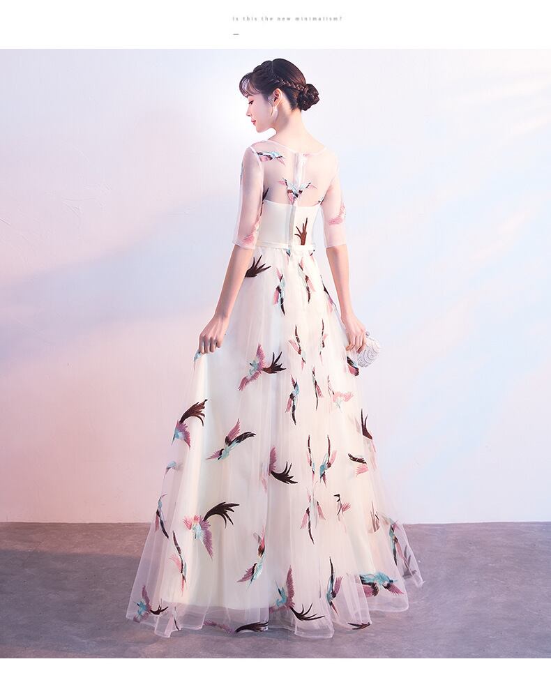 花柄刺繍レースパーティ-ロングドレスです。袖やデコルテの透け感がとても美しく大人の女性を醸し出してくれるエレガントなロングドレスです。全体に立体刺繍が施されデザイン性のあるスタイルがとても魅力的な一着です。全体的に優しい感じに仕上げられています。背中ファスナ-有。胸パット付き。